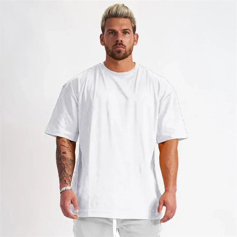Solid Color Gym Running Sport Clothing Fitness Oversized Loose Cotton Shirt Men Hip Hop Short Sleeve Bodybuilding Muscle T-shirt